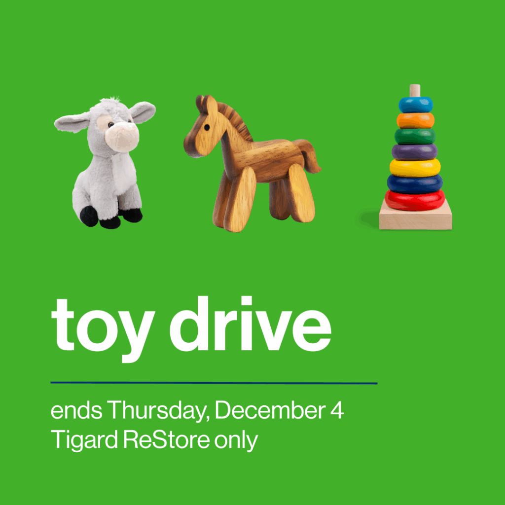 Spreading joy around this season is toy-riffic! We are collecting donations of brand new toys at the Tigard ReStore for the local non-profit, With Love Oregon. These toys will go to families who can lovingly choose special gifts and stocking stuffers for the little ones, ages 0-6, in their care. We’re giving out a coupon for 15% off your entire purchase at the Tigard ReStore for every toy donation. This toy drive runs from Monday, November 17 – Thursday, December 4.